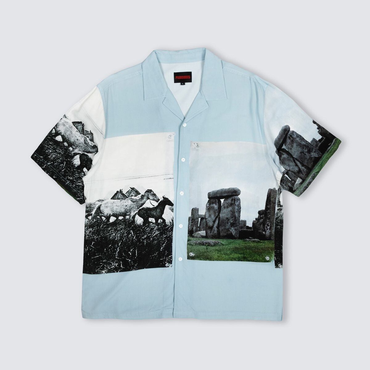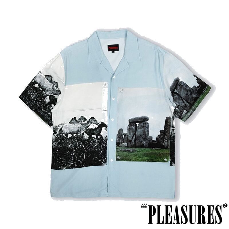 【PLEASURES/プレジャーズ】STONE HORSE BUTTON DOWN 半袖シャツ / POWDER BLUE / SP25-12964