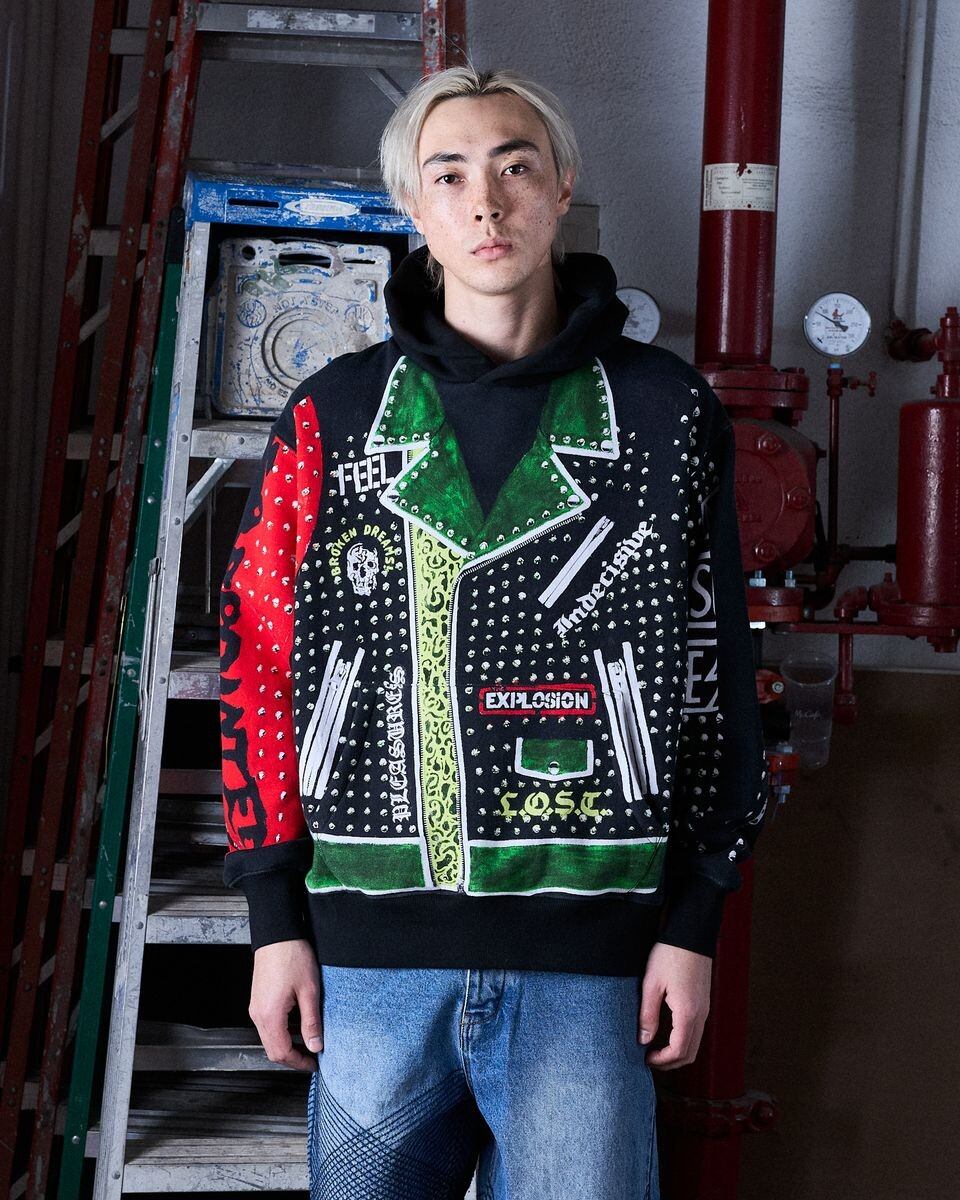 パネル全体にはレザージャケットをモチーフにしたプリントが施されており、個性的で存在感のあるデザインに仕上がっています。
