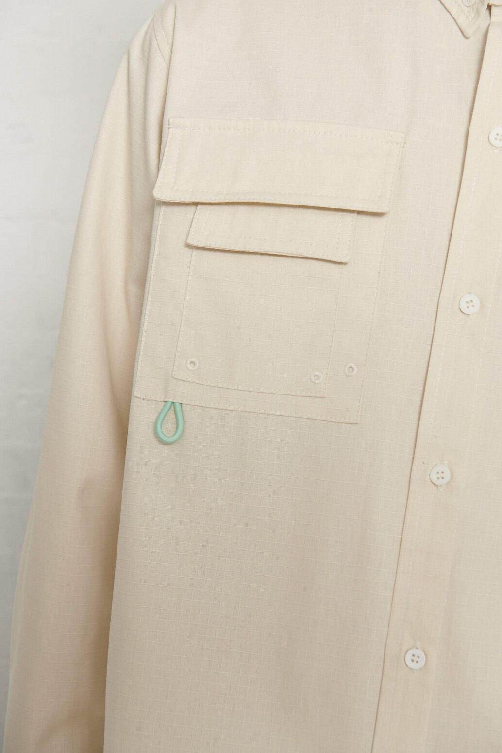 襟はボタンダウンタイプでフロントのフラップポケットと左胸にオリジナルパッチが片方だけマジックテープで開閉できるようになっています。