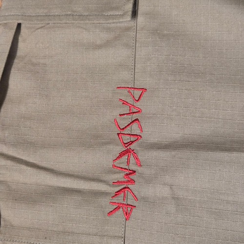 随所に "FISH" グラフィックのナイロンパッチや刺繍がデザインされており、かなりゆったりしたバギータイプのカーゴパンツです。