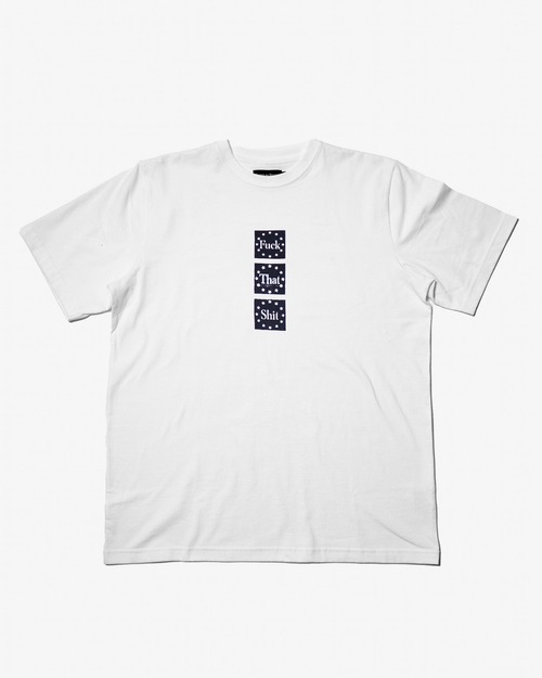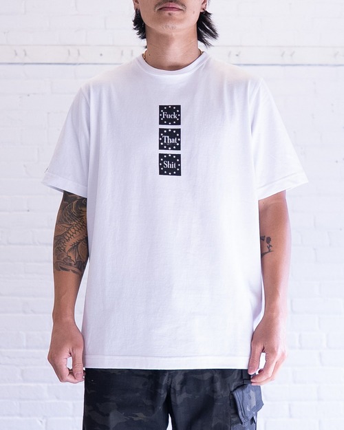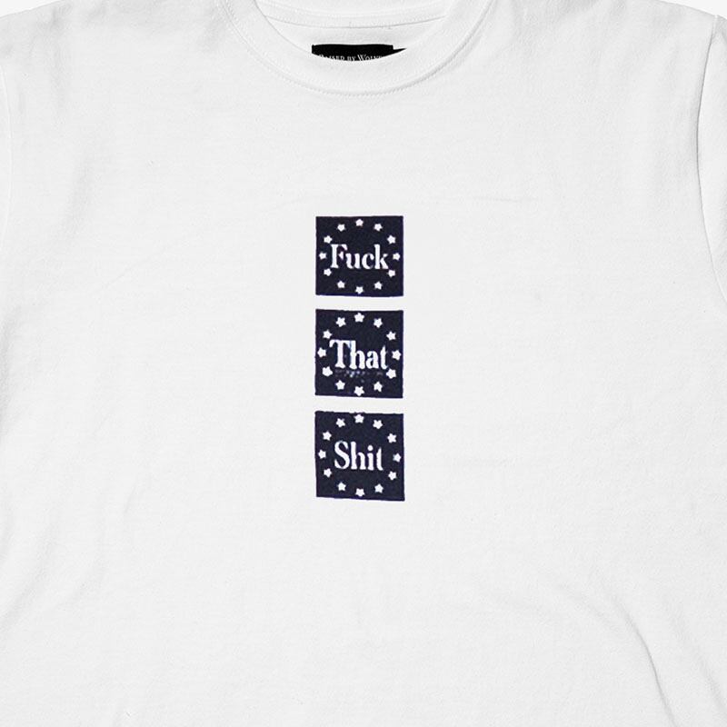 フロント中央に配置された縦並びのグラフィックが印象的なデザイン。”Fuck That Shit”「そんなのクソくらえ」というメッセージが込められた一枚です。カナダ製、200 gsmのコットンジャージーは肌触りがよく着心地の良さが売りです。