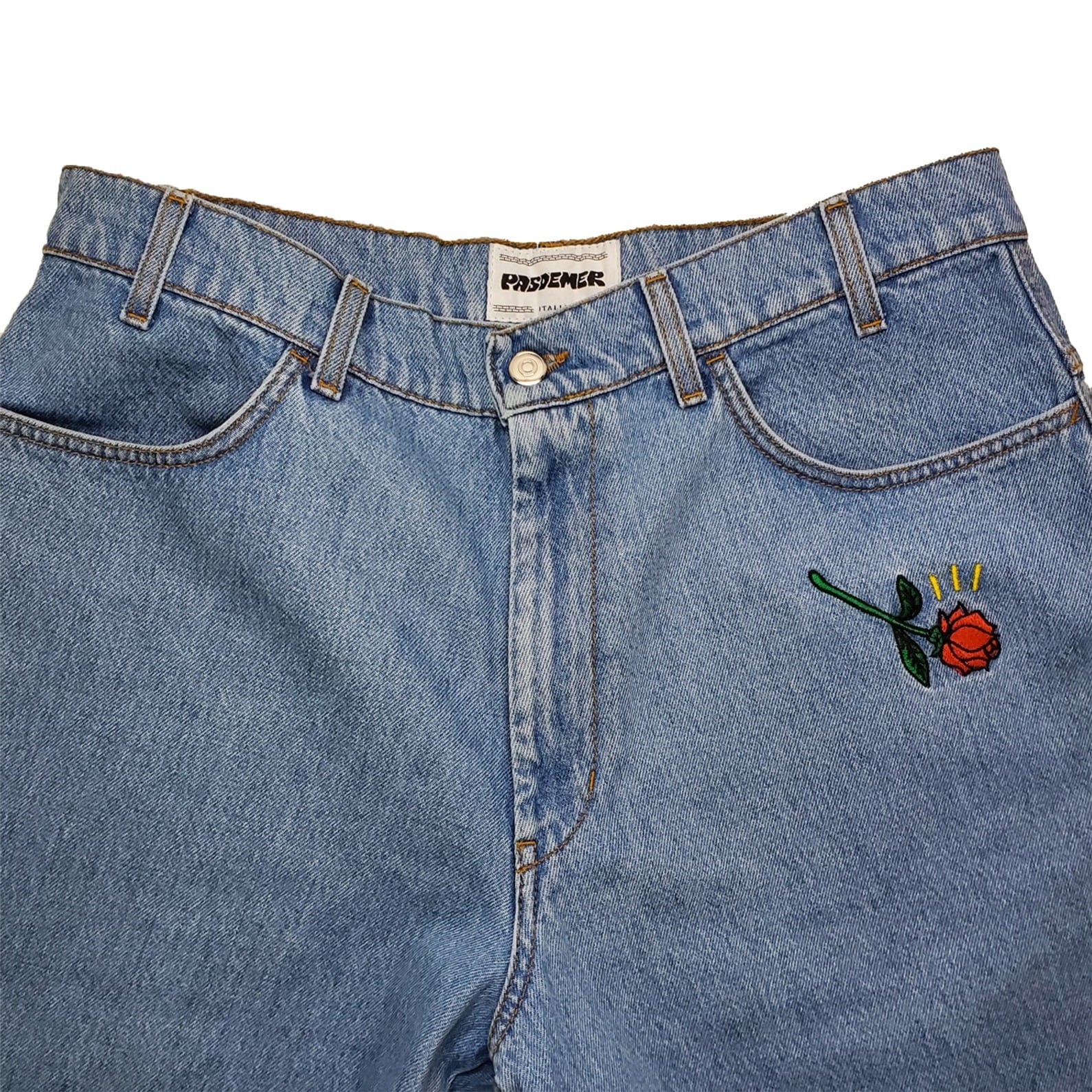 フロント左ポケット下に刺繍で バラのグラフィックがデザインされています。