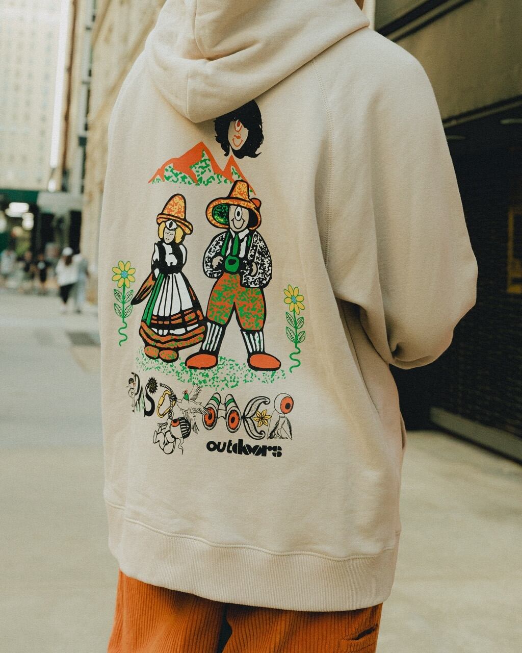 フロントとバックにはプリントで OUTDOORS グラフィックがデザインされています。