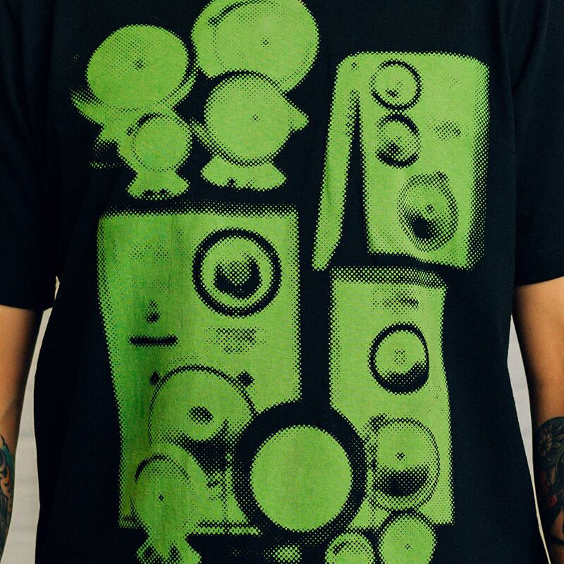 様々なスピーカーのスクリーンプリントが特徴のTシャツです。